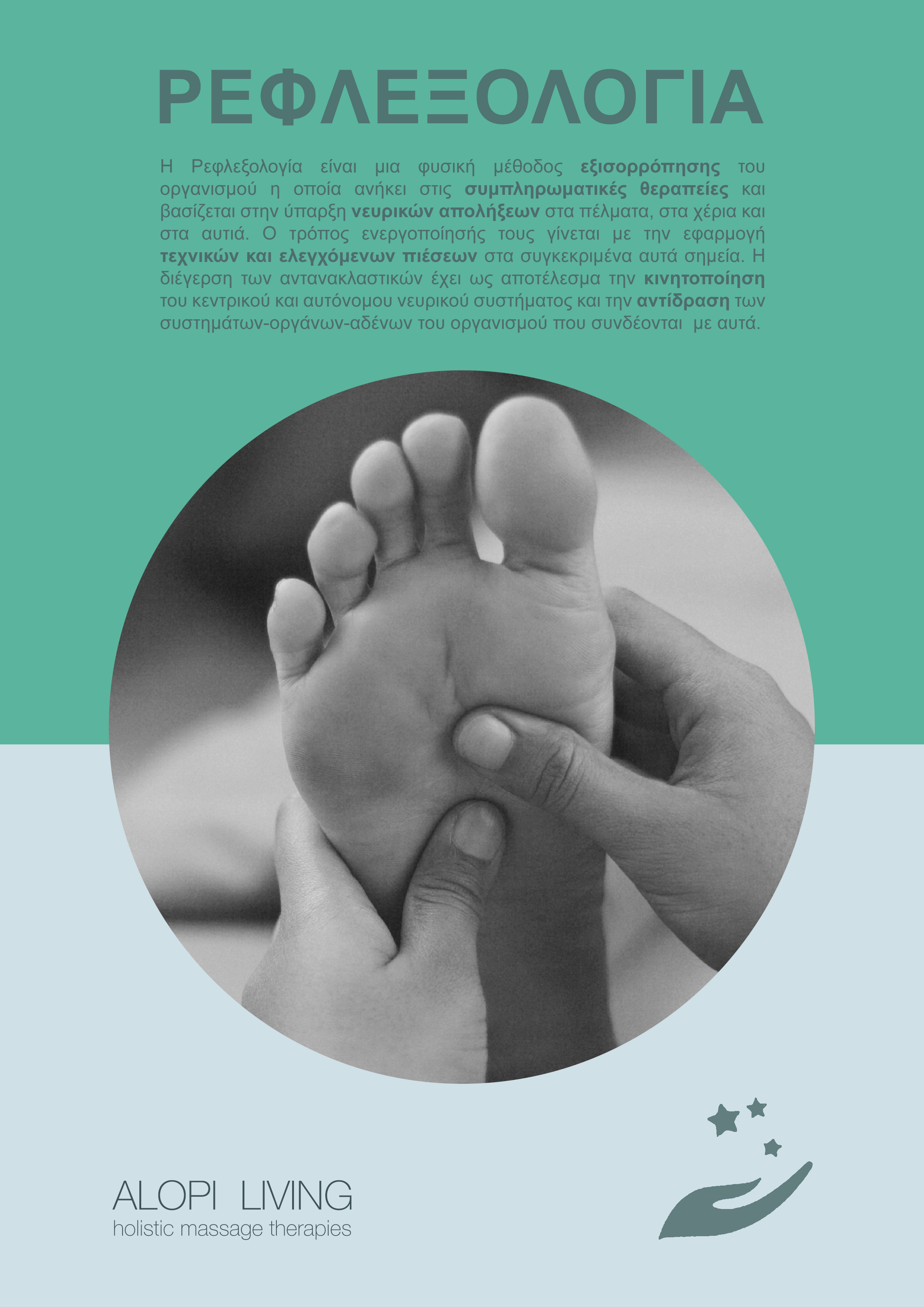 Τα τελευταία χρόνια διαπιστώνεται αυξημένο ενδιαφέρον για τις ήπιες, φυσικές και συμπληρωματικές μεθόδους φροντίδας της υγείας. Μια από τις μεθόδους αυτές είναι και η Ρεφλεξολογία. Η Ρεφλεξολογία είναι η επιστήμη η οποία ασχολείται με τα αντανακλαστικά σημεία στα πέλματα και τις παλάμες, που αντιστοιχούν σε κάθε όργανο και τμήμα του σώματος. Διεγείροντας αυτά τα αντανακλαστικά σημεία με ειδικές πιέσεις και φυσικούς χειρισμούς, απελευθερώνονται οι αυτοθεραπευτικές δυνάμεις του σώματος και έτσι επιτυγχάνουμε την ενεργοποίηση, χαλάρωση και εξισορρόπηση του οργανισμού.