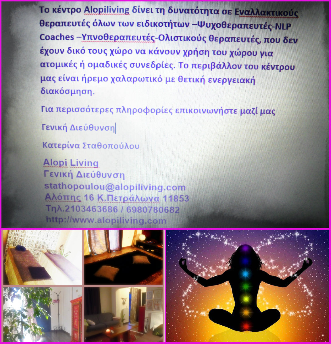 Το κέντρο Alopiliving δίνει τη δυνατότητα σε εναλλακτικούς θεραπευτές όλων των ειδικοτήτων –Ψυχοθεραπευτές-NLP Coaches –Υπνοθεραπευτές-Ολιστικούς θεραπευτές, που δεν έχουν δικό τους χώρο να κάνουν χρήση του χώρου για ατομικές ή ομαδικές συνεδρίες. Το περιβάλλον του κέντρου μας είναι ήρεμο χαλαρωτικό με θετική ενεργειακή διακόσμηση.